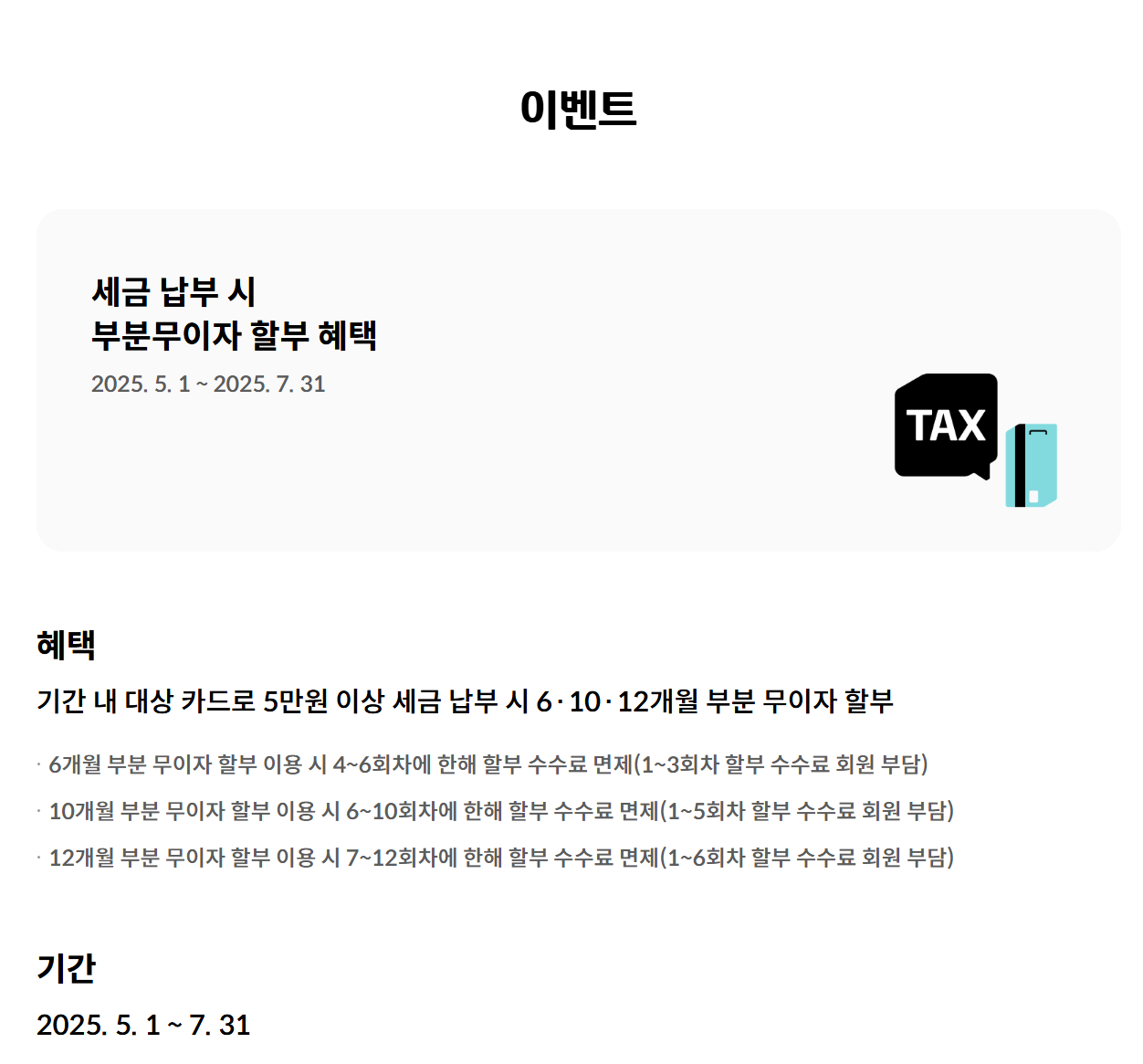 - 현대카드는 부분 무이자 할부 혜택을 제공합니다.(2025.5.1~7.31)